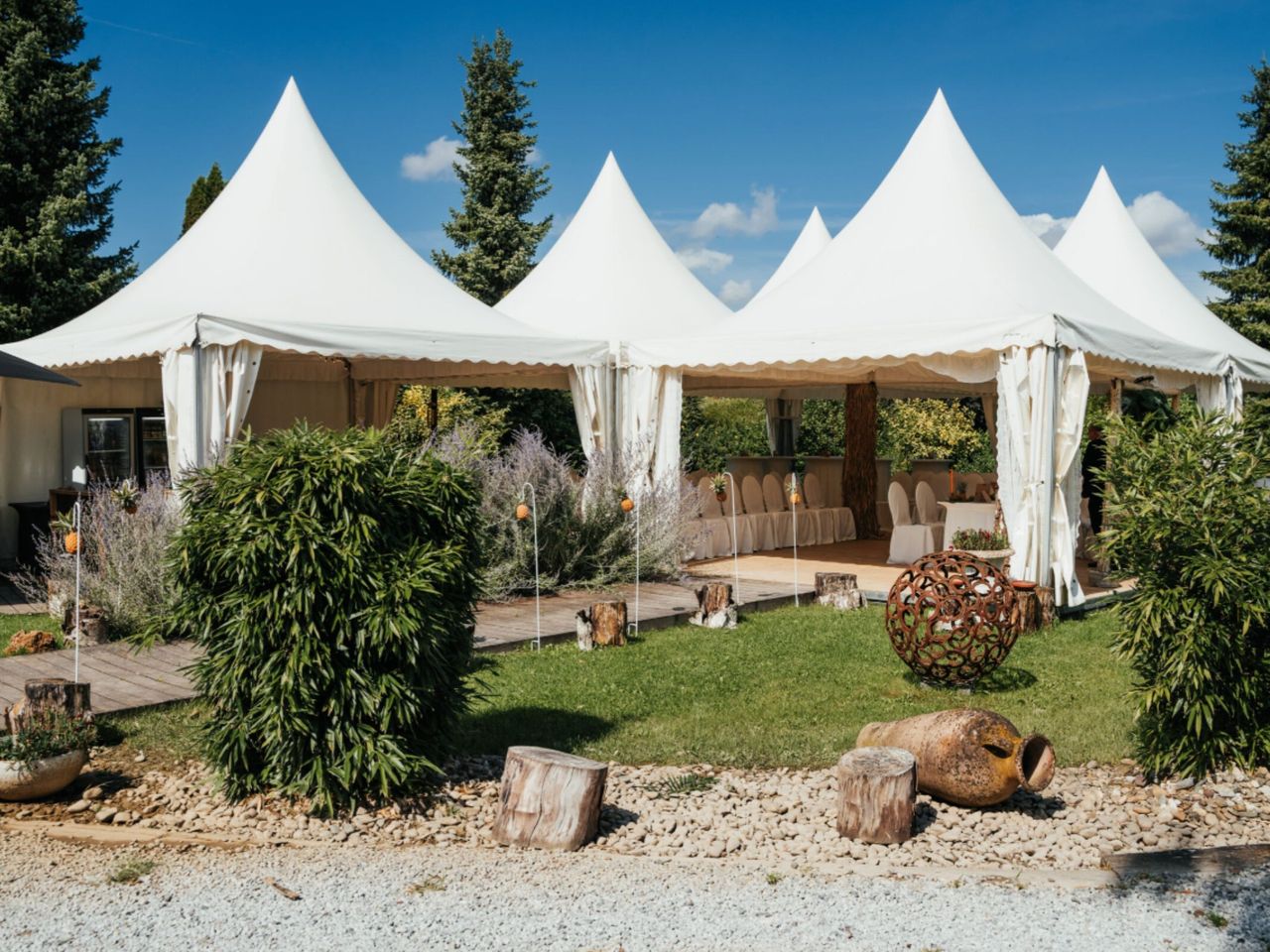 En été, les espaces extérieurs, agrémentés de superbes pagodes blanches, sont entièrement privatisables. Ils offrent une grande flexibilité et peuvent recevoir jusqu’à 170 personnes en walking dinner, 80 convives pour un repas assis ou 100 participants en configuration théâtre, idéale pour conférences et séminaires.