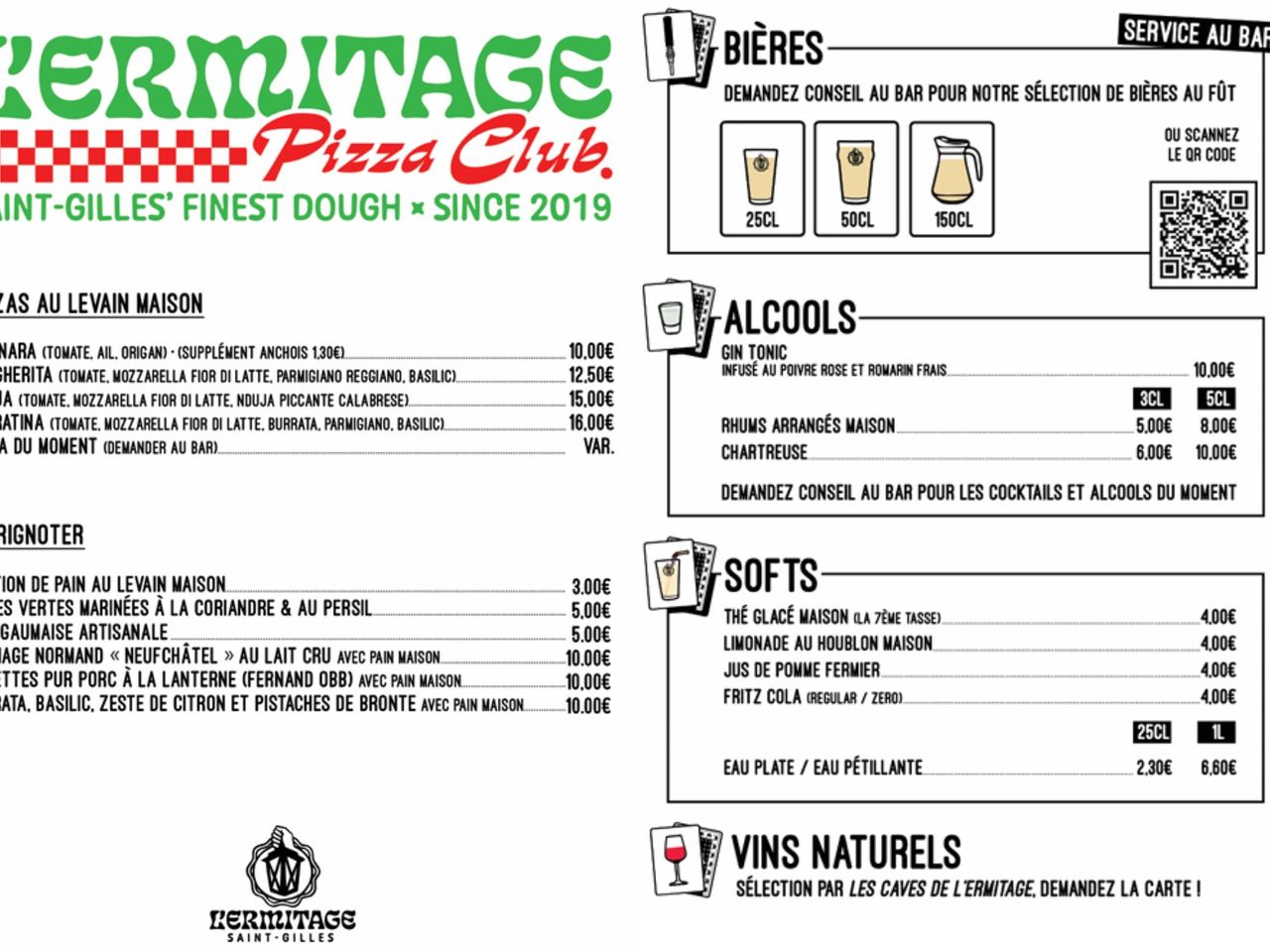 Pour accompagner ces boissons, le bar propose également des pizzas au levain maison et des produits artisanaux à partager. Que vous soyez en quête d’un moment de détente entre amis ou d’une soirée animée, l’Ermitage Saint-Gilles vous accueille dans une ambiance chaleureuse et décontractée.